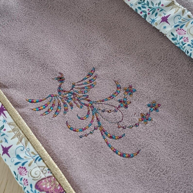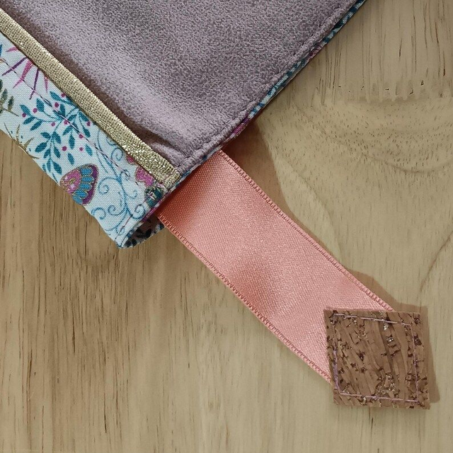 Matières : simili cuir brossé rose pâle et tissu coton Oeko-Tex Makower coloris crème (motifs papillons, soleils et fleurs)