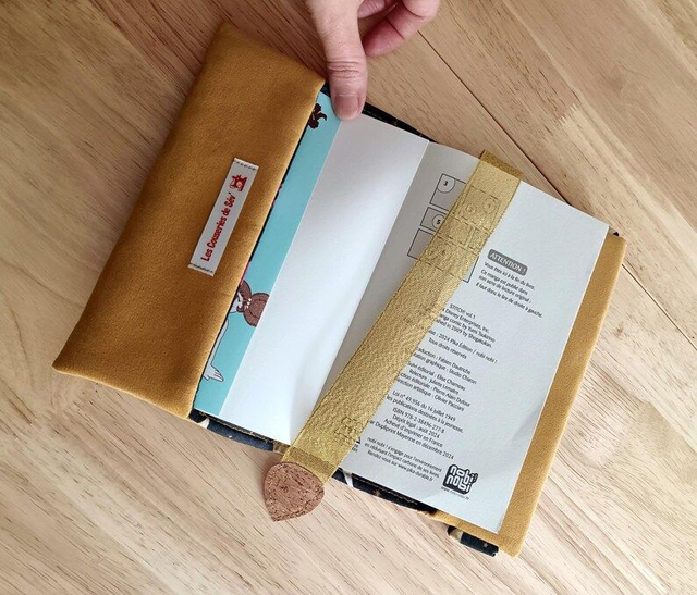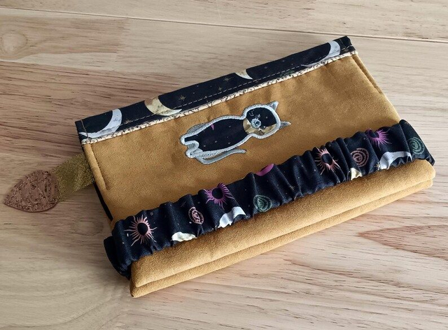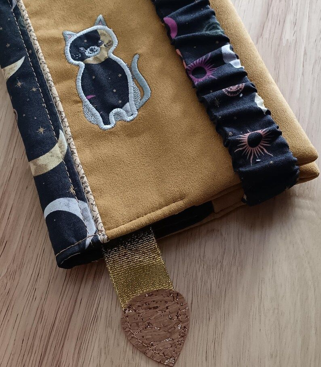 Protège livre élégant en suédine moutarde et coton Imprimé motif lune – Couvre livre personnalisé et broderie chat