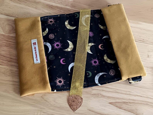 - Matériaux : Suédine moutarde et coton imprimé noir « Metallic Moonlight » motif lune